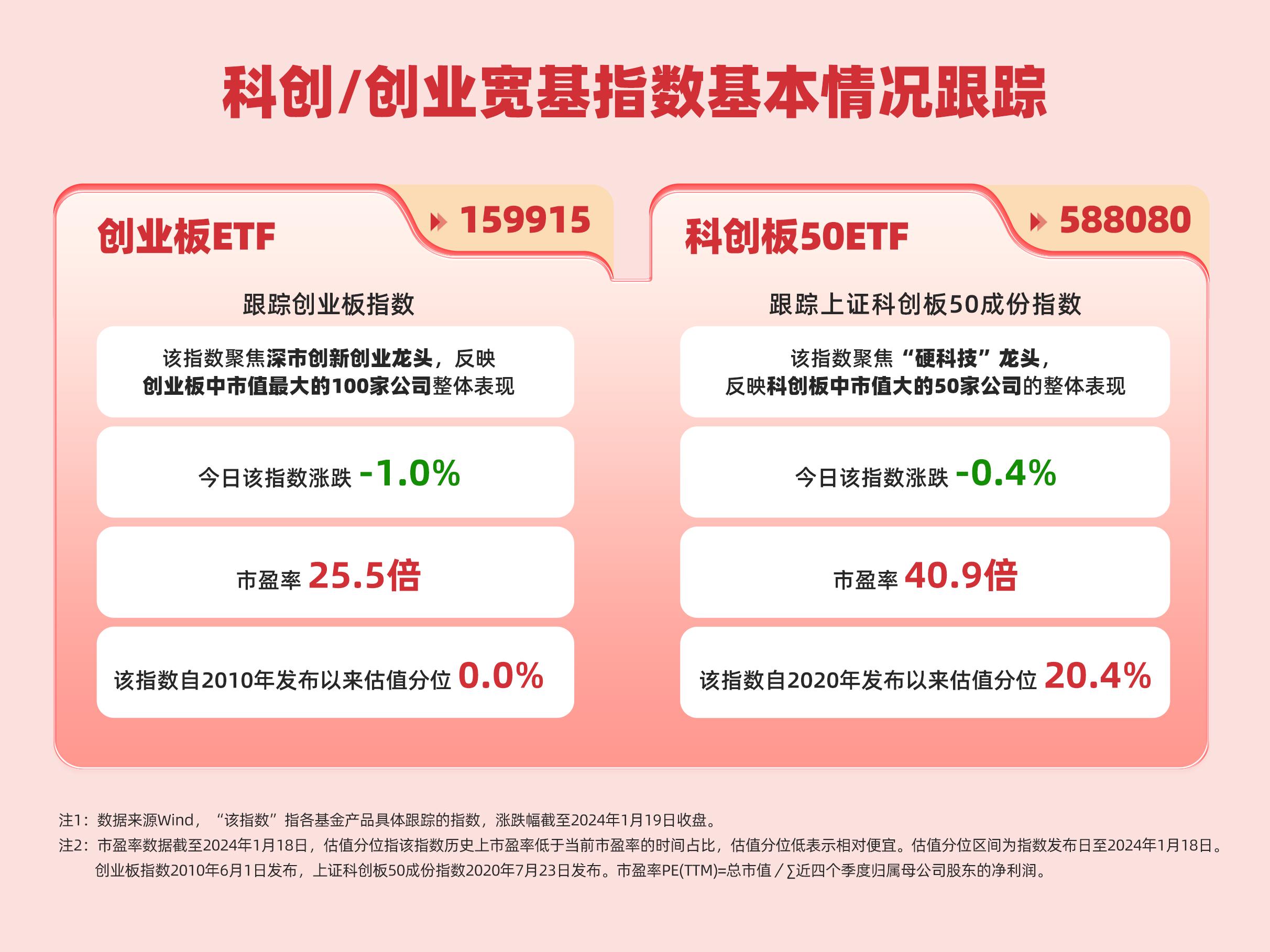 财联社1月19日电,截至收盘,创业板指数下跌1.0%,上证科创板50成份指数下跌0.4%。当前A股成长板块估值处于历史低位,其中,创业板指估值已处于指数2010年发布以来极低位置。创业板ETF(159915)、科创板50ETF(588080)等产品的配置价值受到市场关注。