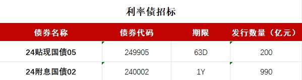 财联社1月24日电,按照此前公布的发行计划,财政部将于上午10:35-11:35招标发行两期国债,分别为:2024年记账式贴现(五期)国债,期限63D,发行量不超过200亿元;2024年记账式附息(二期)国债,期限1Y,发行量不超过990亿元。