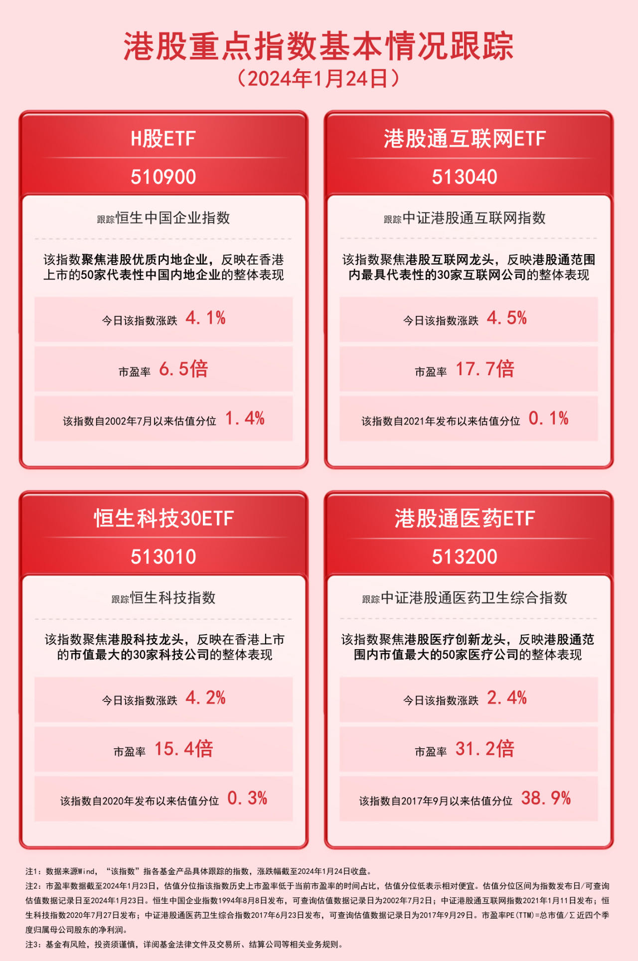 财联社1月24日电,今日港股市场继续反弹,恒生中国企业指数跳空高开,截至收盘涨4.1%。当前,恒生中国企业指数等港股宽基估值处于历史低位,且AH溢价指数处于近10年以来高位,性价比突出,H股ETF(510900)的配置价值受到市场关注。