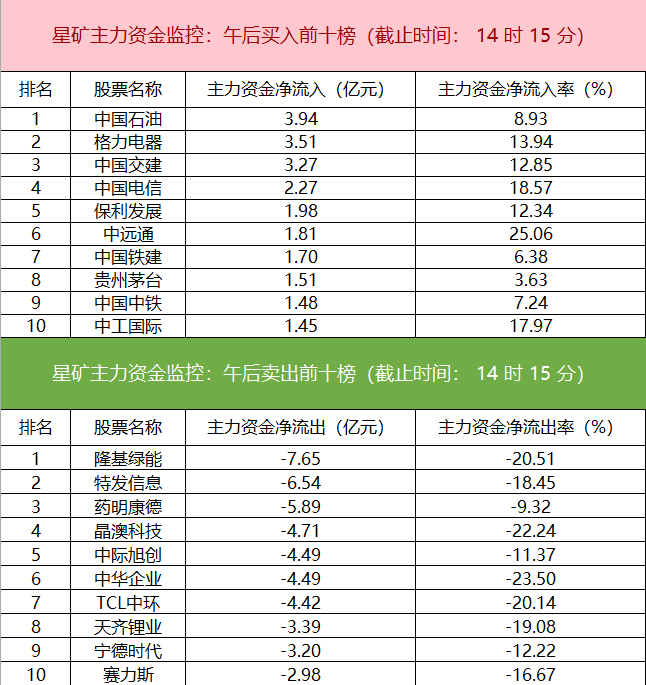 财联社1月29日电,财联社星矿数据显示,今日主力资金净流入建筑工程、石油石化、食品饮料行业等板块,净流出电新行业、计算机、电子等板块,其中电新行业净流出54.01亿元。个股方面,中国石油上涨,主力资金净买入3.94亿元位居首位,格力电器、中国交建、中国电信获主力资金净流入居前;隆基绿能遭净卖出7.65亿元居净流出首位,特发信息、药明康德、晶澳科技等主力资金净流出额居前。