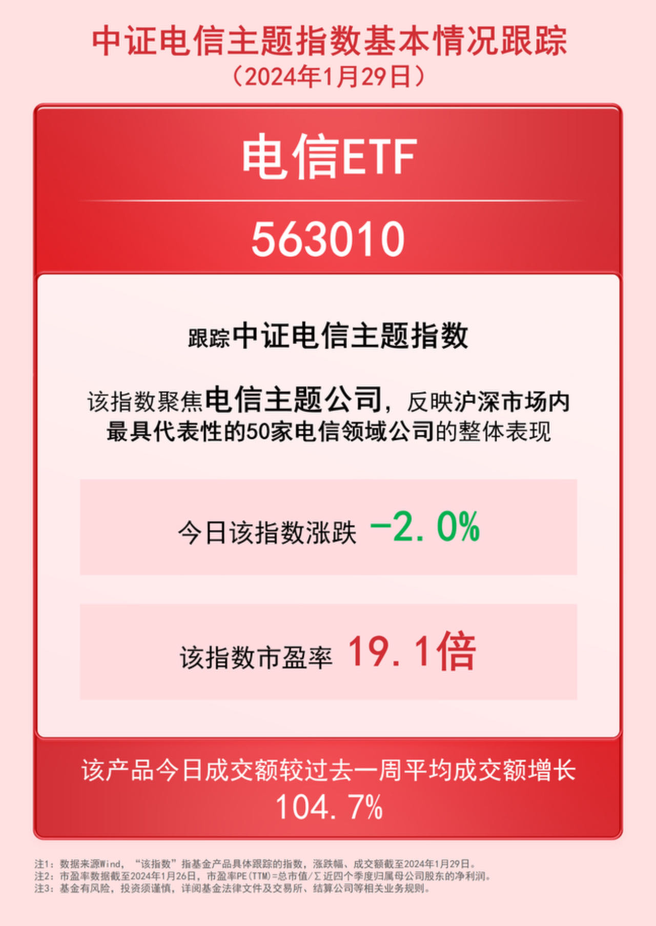 财联社1月29日电,截至收盘,中证电信主题指数下跌近2%,近五个交易日累计上涨4.2%。电信ETF(563010)等跟踪该指数的产品今日成交活跃,可助力投资者布局A股电信龙头。
