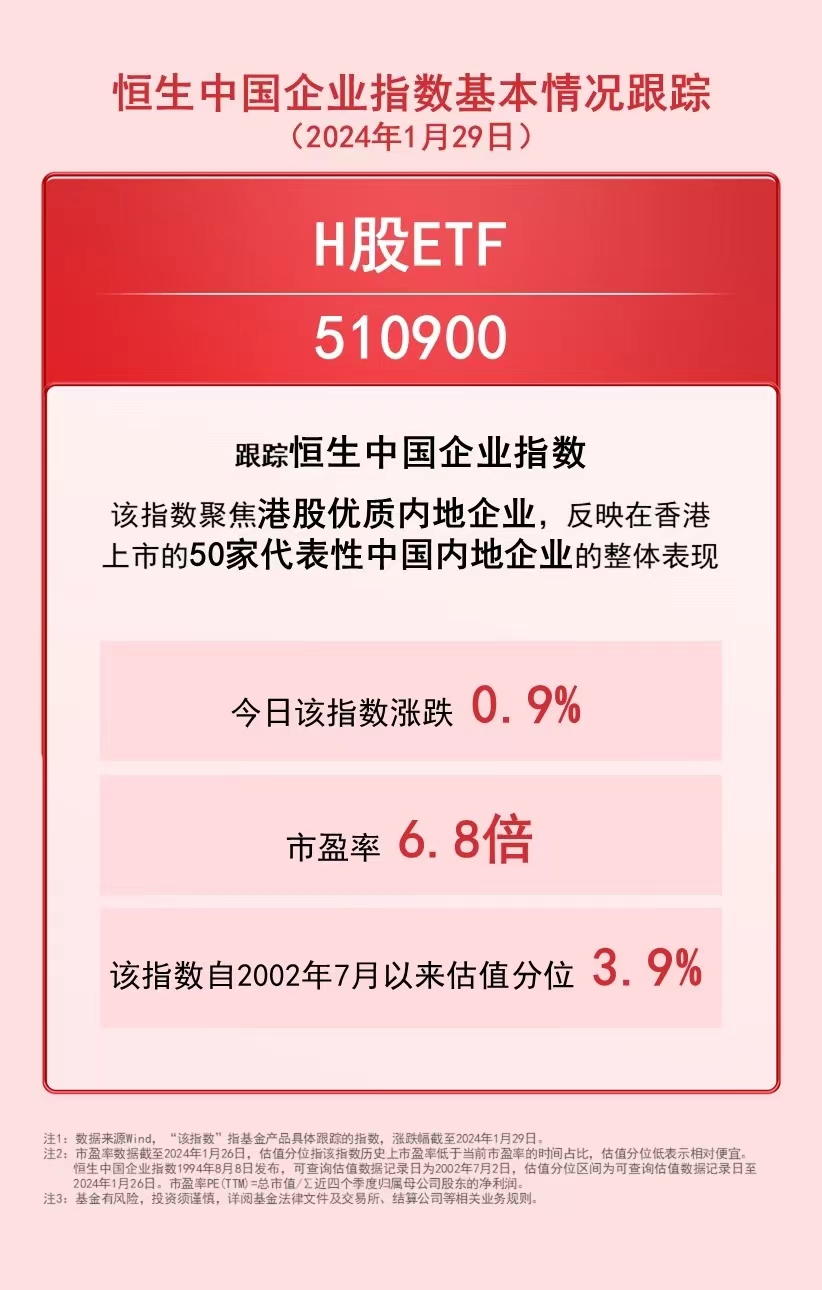 财联社1月29日电,近日,国资委表示将进一步研究将市值管理纳入中央企业负责人业绩考核,引导中央企业负责人更加关注、更加重视所控股上市公司的市场表现,及时通过运用市场化的增持、回购等手段来传递信心、稳定预期,加大现金分红力度来更好地回报投资者。恒生中国企业指数选取在港上市的中国内地企业中综合市值排名最高的50只证券,前十大权重股中,包括中国建设银行、中国移动等“中字头”企业。H股ETF(516900)紧密跟踪恒生中国企业指数,有望受益于央企市值考核带来的价值重估。