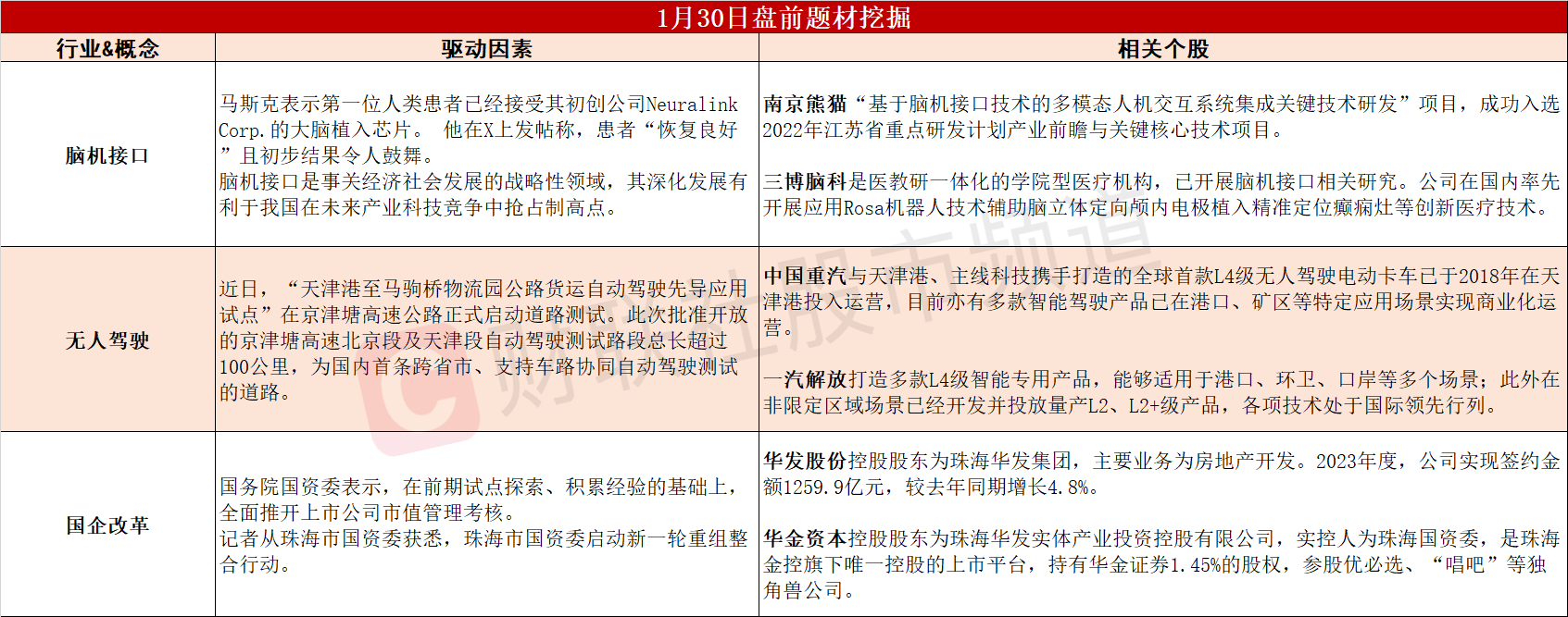 ①首位人类患者已接受大脑植入手术,脑机接口行业迎来重大突破。②国内首条跨省市自动驾驶道路测试启动,自动驾驶应用规模效应显现。③国资委全面推开上市公司市值管理考核,珠海市国资委启动新一轮重组整合行动。