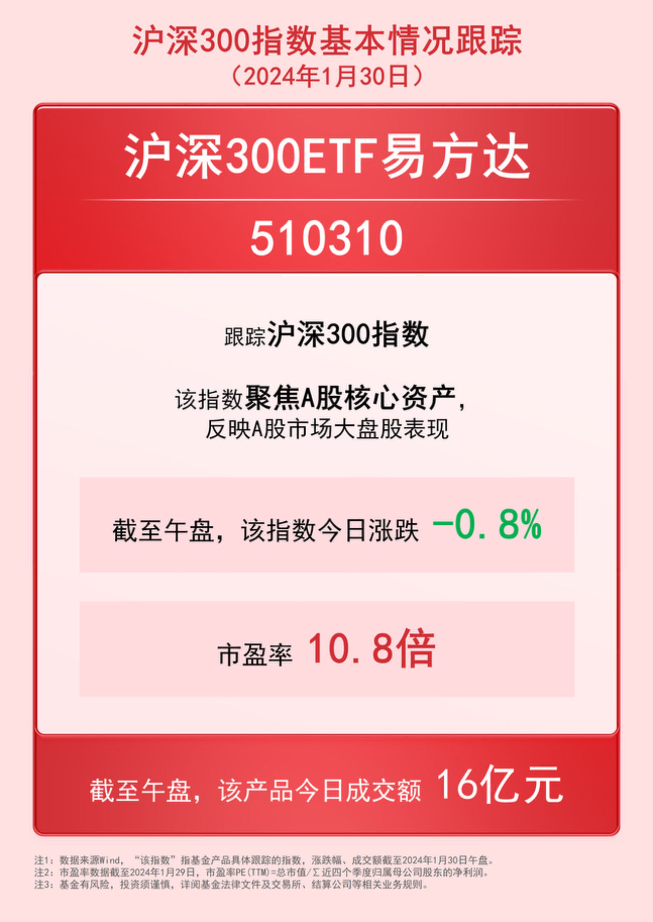 财联社1月30日电,截至午盘,沪深300指数下跌0.8%,沪深300ETF易方达(510310)等产品交投活跃,盘中成交额已达16亿元。长城证券认为,当前市场进入数据真空期,往后看,市场可能因为政策面、投资者情绪、估值回升以及资金流向等方面的边际改善而出现反弹,而这些方面的积极因素近期均有所改善。沪深300指数聚焦A股核心资产,当前指数市盈率(PE-TTM)不到11倍,处于2005年指数发布以来15%分位处,具备长期配置价值。沪深300ETF易方达管理费率加托管费率仅0.2%/年,可助力投资者低成本布局市场修复机遇。