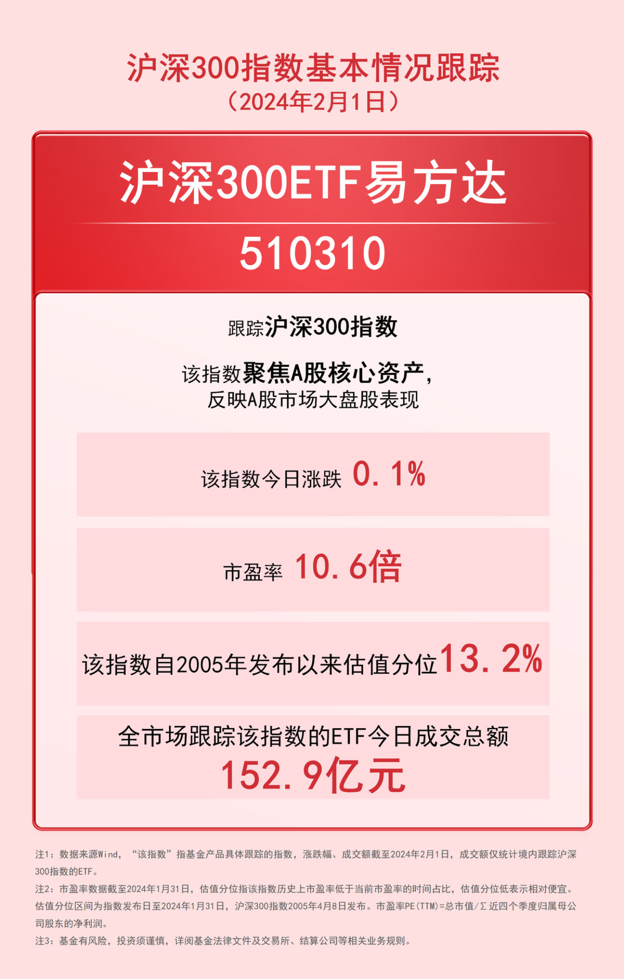 财联社2月1日电,国家统计局公布数据显示,1月份,我国制造业采购经理指数、非制造业商务活动指数和综合PMI产出指数分别为49.2%、50.7%和50.9%,比上月上升0.2、0.3和0.6个百分点,我国经济景气水平有所回升。广发证券研究指出,1月PMI呈现出四个特点:一是过去以来的“供给强于需求”的特征延续;二是出口有改善迹象;三是行业间分化明显;四是在产需比偏高的背景下,两个价格指标环比走弱,尚未企稳,这意味着PPI短期内依然有压力。1月以来,政策联动出台的特征更为明显,这种累积效应将最终有利于风险偏好的企稳。沪深300指数聚焦A股核心资产,目前指数市盈率(PE-TTM)为10.6倍,估值处于2005年发布以来13.2%分位,沪深300ETF易方达(510310)管理费率加托管费率合计0.2%/年,可助力低成本配置沪深300指数。