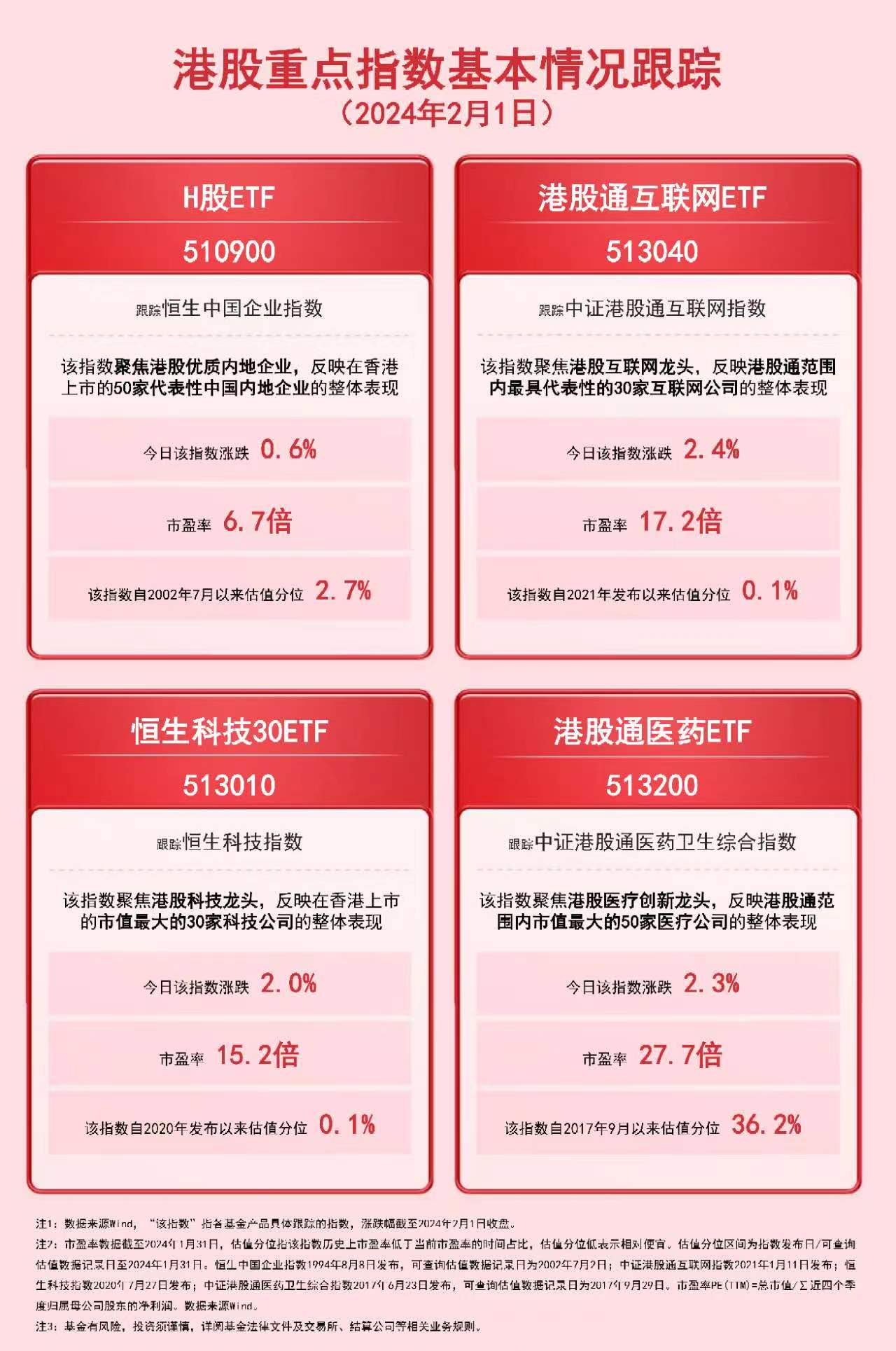 财联社2月1日电,截至收盘,今日恒生中国企业指数上涨0.6%,中证港股通互联网指数上涨2.4%,恒生科技指数上涨2.0%,中证港股通医药卫生综合指数上涨2.3%。H股ETF(510900)、港股通互联网ETF(513040)、恒生科技30ETF(513010)、港股通医药ETF(513200)等产品跟踪港股重点指数,可助力投资者布局港股核心资产。
