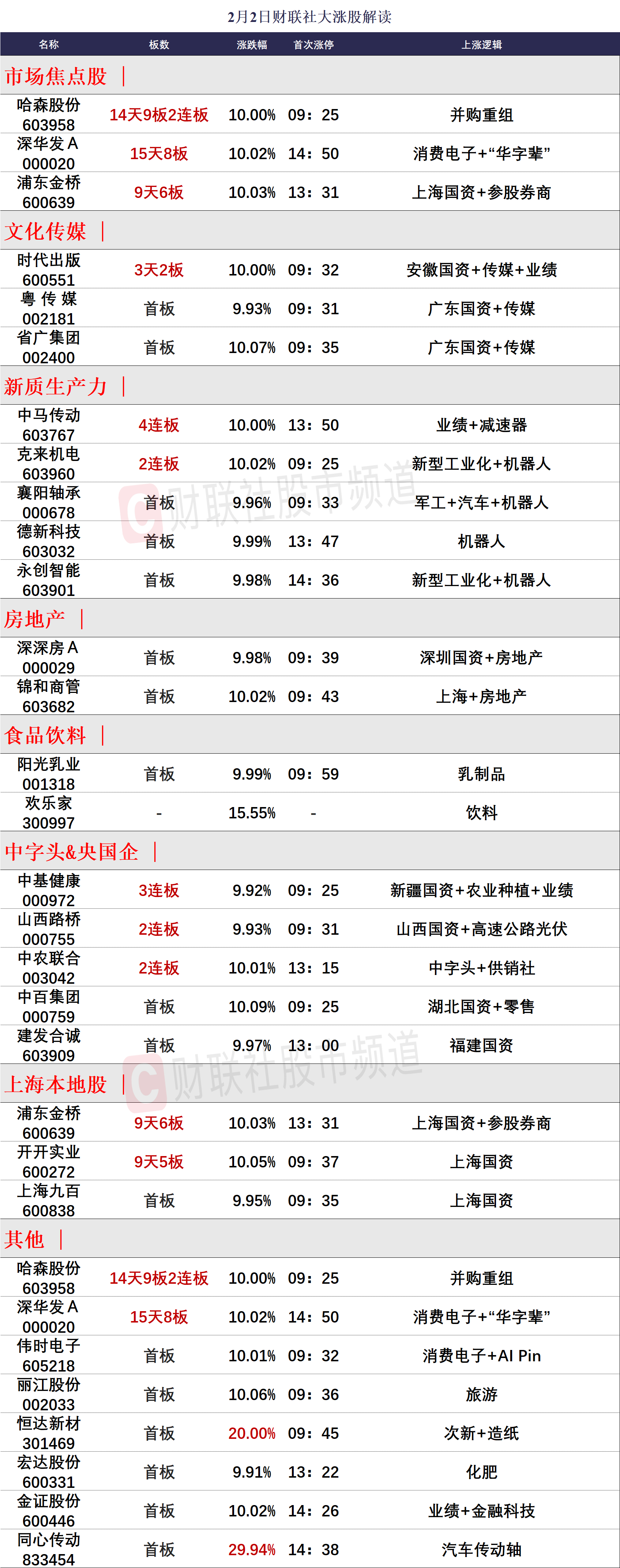 今日共27股涨停,连板股总数6只,30股封板未遂,封板率为47%(不含ST股、退市股及未开板新股)。个股方面,并购重组的哈森股份14天9板,华字辈个股深华发A15天8板,上海本地股浦东金桥9天6板、开开实业9天5板,机器人概念股中马传动4板、克来机电2板,国企改革板块中基健康3板、山西路桥2板、中农联合2板,传媒股时代出版3天2板。今日沪深两市收涨个股368只,收跌个股4704只。