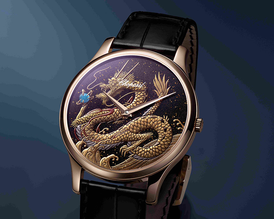 迄今为止,品牌已连续12年推出L.U.C XP生肖主题莳绘腕表,此次问世的第十二款生肖时计作品,由享誉国际的莳绘工艺大师在日本手工绘制完成,打造出色泽浓重典雅的深黑色表盘,并点缀金粉与珍珠母贝微粒,生动呈现祥龙的腾跃姿态。玫瑰色18K金打造的39.5毫米直径表壳,内部搭载配备微型摆陀的L.U.C 96.17-L机芯。腕表限量发行88枚。
