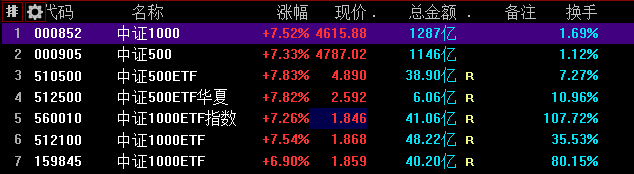 财联社2月6日电,中证1000、中证500双双涨超7%领涨各大指数,与此同时中证1000ETF指数(560010)、中证500ETF(510500)、中证500ETF华夏(512500)均涨超7%。