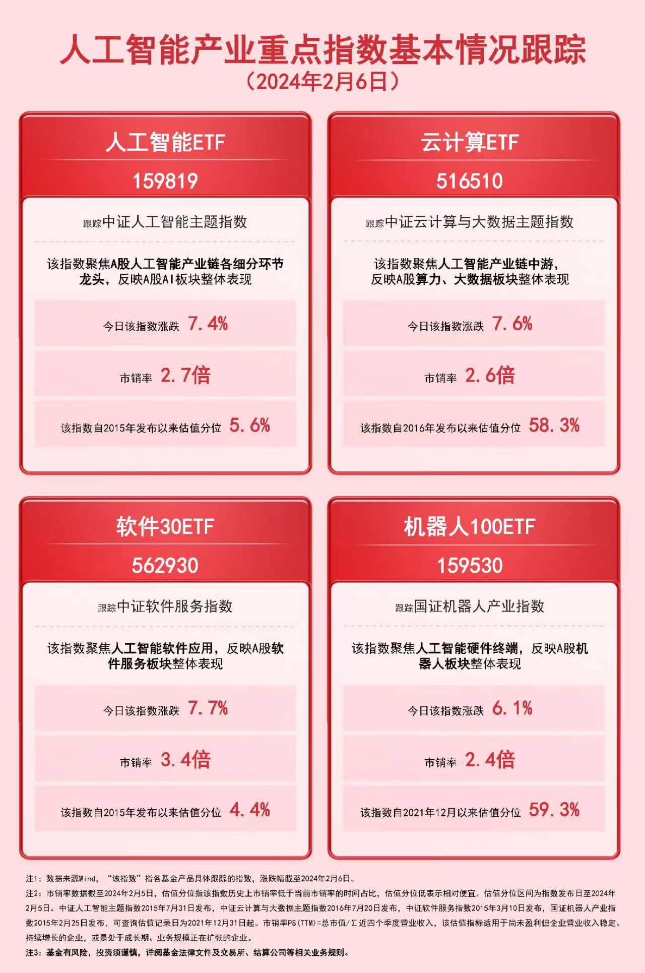 财联社2月6日电,截至收盘,中证人工智能主题指数、中证云计算与大数据主题指数、中证软件服务指数、国证机器人产业指数均涨超6%