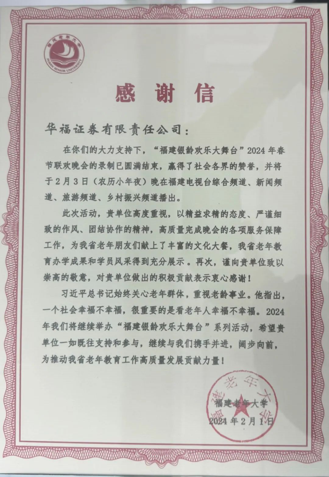 值此新春之际,华福证券携手福建老年大学为广大老年朋友送上真挚的祝福,未来我们将继续携手服务好“夕阳”群体,助力老年朋友安享幸福晚年。