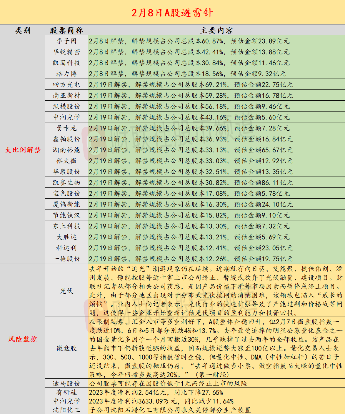 昨日没有公司发布减持公告;李子园、华锐精密将迎来超四成以上解禁;市场企稳下微盘仍跌10%,量化交易人士表示,微盘股的抛压仍存;迪马股份可能存在因股价低于1元而终止上市的风险;光伏融资遇冷,多个十亿元定增“踩刹车”,多地分布式光伏消纳也告急;有研硅2023年度净利润2.54亿元,同比下降27.65%;热门中概股普跌,纳斯达克中国金龙指数跌超1%。