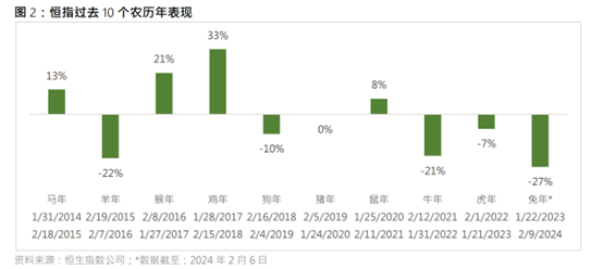 恒指于1969年11月24日推出,今年即将迎来55周年纪念。经过逾半个世纪后,香港股票市场已经步入第五个生肖周期,并将会在2024年2月10日迎接龙年的来临。即将过去的兔年港股表现欠佳,截至2024年2月6日为止录得近27%的跌幅(图1),为近年表现最差的农历年(图2),以及历来表现最差的兔年,因此接下来的龙年表现如何,相信是不少投资者心中的首要困惑。