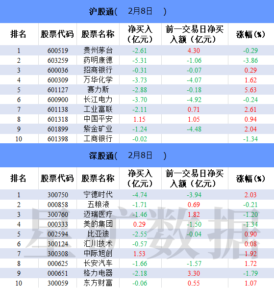 财联社2月8日电,北向资金今日净买入5.83亿元。中际旭创、中国平安、美的集团分别获净买入1.53亿元、1.15亿元、0.29亿元。药明康德净卖出额居首,金额为5.31亿元。