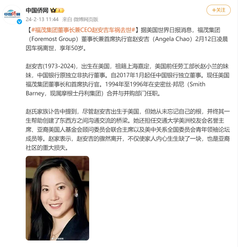 中国侨网官方微博援引美国世界日报消息,福茂集团(Foremost Group)董事长兼首席执行官赵安吉(Angela Chao)2月12日凌晨因车祸离世,享年50岁。