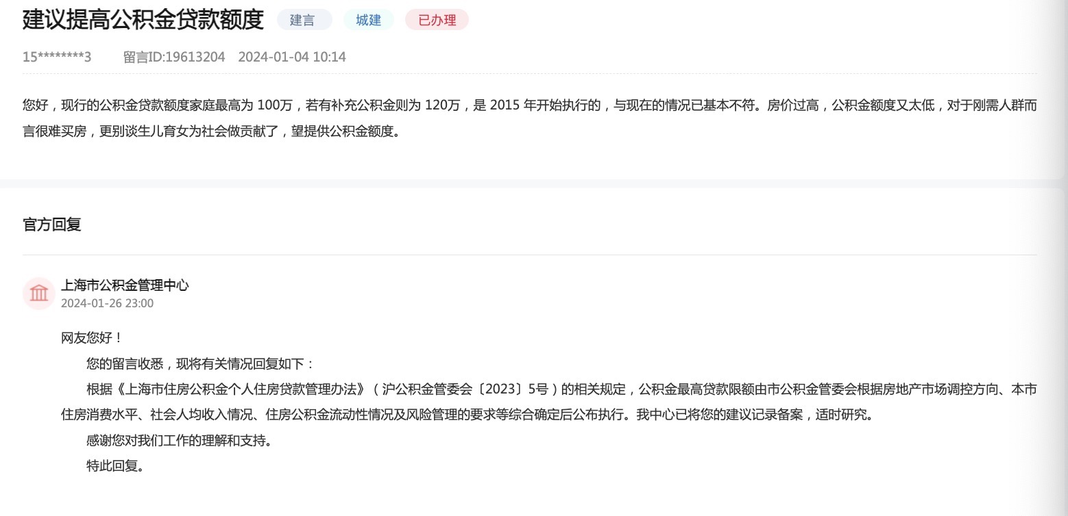 财联社2月17日电,近日有上海网友在人民网领导留言板表示,现行的公积金贷款额度家庭最高为100万元,若有补充公积金最高为120万元,是2015年开始执行的,与现在的情况已基本不符,从刚需人群的角度考虑,建议提高公积金额度。上海市公积金管理中心回复称,根据《上海市住房公积金个人住房贷款管理办法》(沪公积金管委会〔2023〕5号)的相关规定,公积金最高贷款限额由市公积金管委会根据房地产市场调控方向、本市住房消费水平、社会人均收入情况、住房公积金流动性情况及风险管理的要求等综合确定后公布执行。中心已将建议记录备案,适时研究。