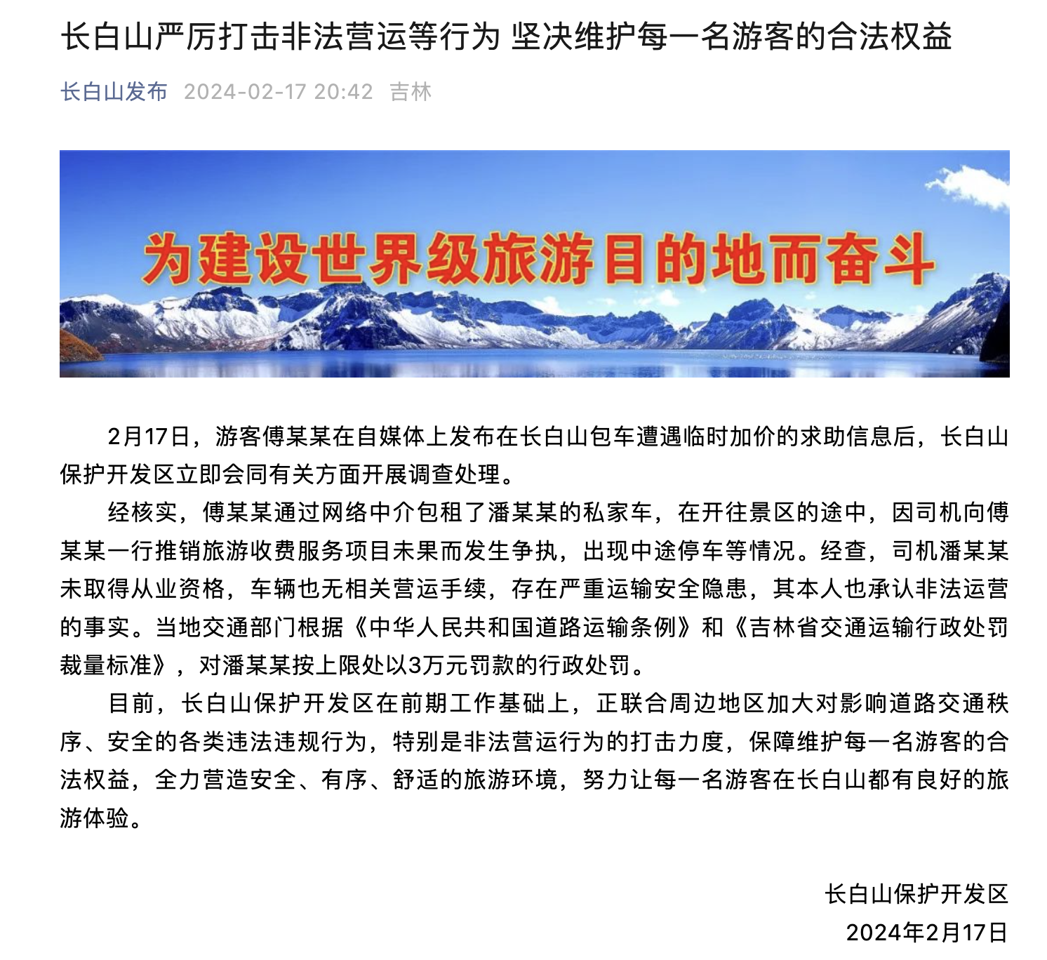财联社2月17日电,长白山保护开发区2月17日发布通报称,2月17日,游客傅某某在自媒体上发布在长白山包车遭遇临时加价的求助信息后,长白山保护开发区立即会同有关方面开展调查处理。经核实,傅某某通过网络中介包租了潘某某的私家车,在开往景区的途中,因司机向傅某某一行推销旅游收费服务项目未果而发生争执,出现中途停车等情况。经查,司机潘某某未取得从业资格,车辆也无相关营运手续,存在严重运输安全隐患,其本人也承认非法运营的事实。当地交通部门根据《中华人民共和国道路运输条例》和《吉林省交通运输行政处罚裁量标准》,对潘某某按上限处以3万元罚款的行政处罚。