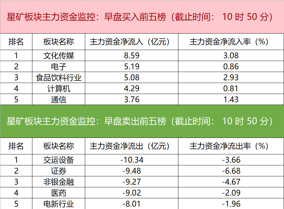 财联社2月19日电,财联社星矿数据显示,今日早盘主力资金净流入文化传媒、电子、食品饮料行业等板块,净流出交运设备、证券、非银金融等板块,其中交运设备板块净流出超10亿元。个股方面,工业富联涨停,主力资金净买入4.87亿元位居首位,五粮液、天孚通信、拓维信息获主力资金净流入居前;药明康德遭净卖出超3亿元,长安汽车、东方财富、立讯精密主力资金净流出额居前。