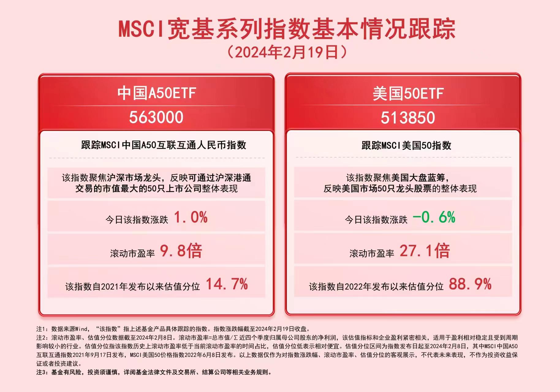 财联社2月19日电,截至今日收盘,MSCI中国A50互联互通人民币指数上涨1.0%,MSCI美国50指数下跌0.6%。