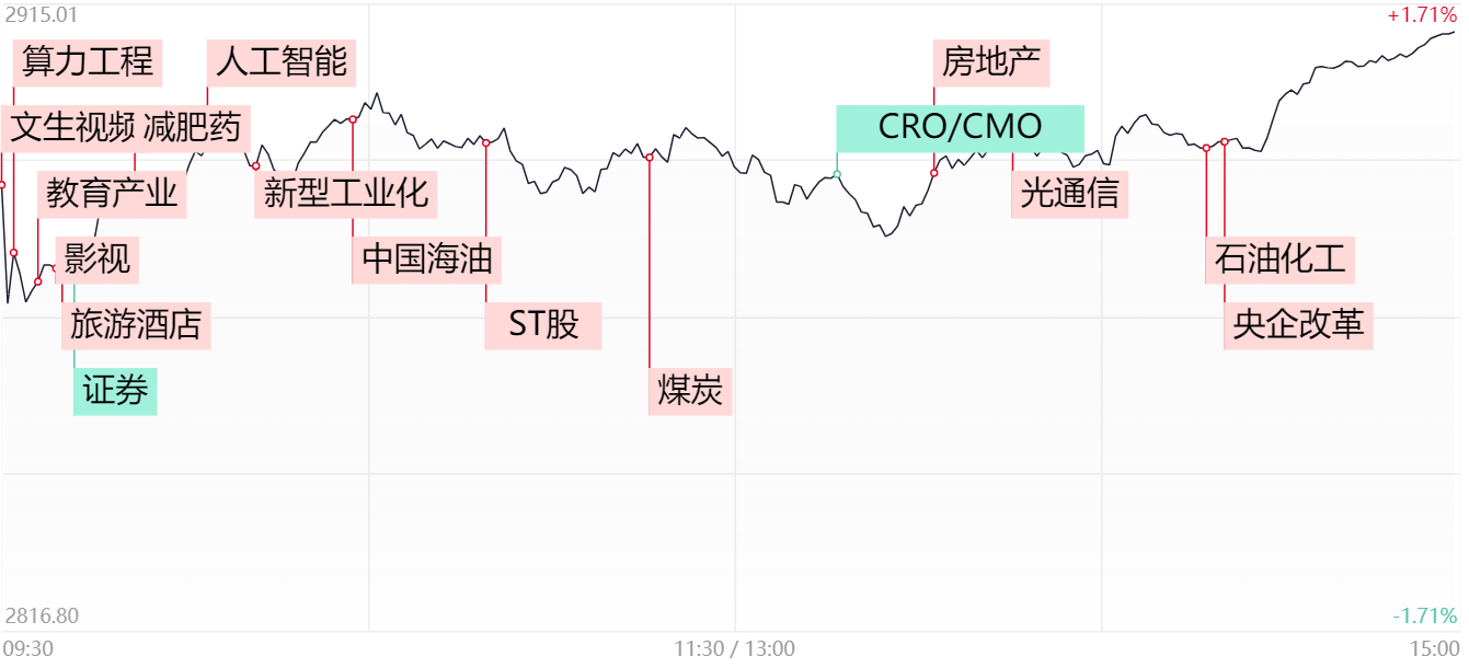 财联社2月20日电,上个交易日,三大股指继续集体高开,在盘初短暂回落后,指数维持强势震荡。AI概念股全面爆发,煤炭、石油等高股息个股延续强势,沪指强势收复2900点大关。沪深两市成交额9572亿,缩量602亿。1)文生视频、多模态AI概念大面积爆发,万兴科技、当虹科技、丝路视觉、因赛集团、易点天下、信雅达、视觉中国、当虹科技等十余家成分股涨停。OpenAI发布文生视频模型Sora,可以将文本快速制作长达一分钟的视频,经过春节长假期间的发酵后,文生视频概念中多股直接开盘封死一字涨停。2)算力硬件方向同样迎来高潮,其中光通信板块中,中际旭创、天孚通信、新易盛三大龙头悉数录得20CM涨停,东田微、联特科技、华天科技、剑桥科技等个股纷纷涨停或涨超10%。算力、存储芯片、AI服务器等方向亦迎来高潮,高新发展、鸿博股份、工业富联、中贝通信等大批成分股涨停。消息面上,Altman计划筹集数万亿美金扩张AI算力基建。分析预计,多模态相关的训练及推理应用将进一步提升对算力基础设施的相关需求。3)教育概念股盘中涨势火热,维海德、榕基软件、二六三、昂立教育、全通教育、开元教育等十余家成分股涨停。日前教育部发布《校外培训管理条例(征求意见稿)》公开征求意见的公告,拟首次将校外培训管理上升为行政法规。春节期间,港股板块之中K12教育涨幅排名第一,为12.19%。4)煤炭、石油、电力等高股息板块呈现加速上扬态势,兖矿能源涨停,中煤能源、中国海油、潞安环能、中国神华、陕西煤业、国投电力、华能水电等多股创出历史或多年阶段新高。部分机构资金开始加速向高股息个股展开调仓。若短期微、小盘股的反弹势头出现动摇,不排除市场或进一步向高股息为首的权重大票的切换可能。