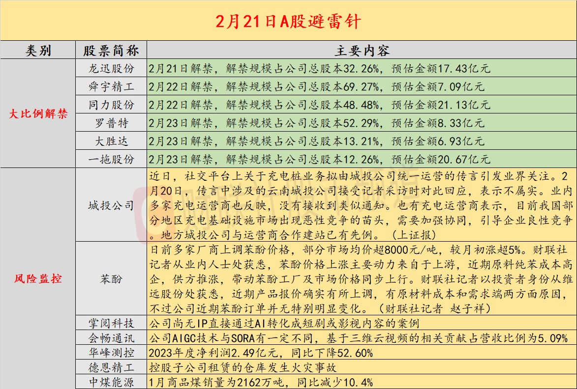 昨日没有公司发布减持公告;罗普特、龙迅股份将迎来超三成以上解禁;沪深交易所量化交易报告制度平稳落地,持续加强对量化交易特别是高频交易的监测分析;掌阅科技尚无IP直接通过AI转化成短剧或影视内容的案例;1分钟卖出沪深股票超25亿元影响正常交易秩序,宁波灵均被沪深交易所暂停交易;会畅通讯表示公司AIGC技术与SORA有一定不同,基于三维云视频的相关贡献占营收比例为5.09%;美股三大指数集体收跌,英伟达、AMD跌超4%。