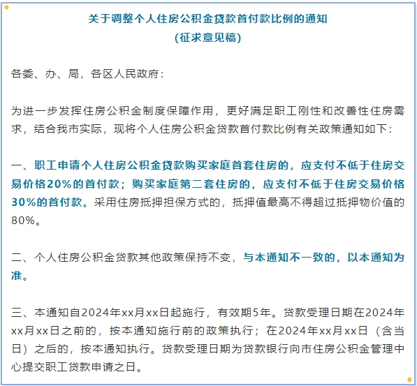 财联社2月21日电,天津市住房公积金管理中心近日公布《关于调整个人住房公积金贷款首付款比例的通知(征求意见稿)》。其中提出,职工申请个人住房公积金贷款购买家庭首套住房的,应支付不低于住房交易价格20%的首付款;购买家庭第二套住房的,应支付不低于住房交易价格30%的首付款。采用住房抵押担保方式的,抵押值最高不得超过抵押物价值的80%。个人住房公积金贷款其他政策保持不变。