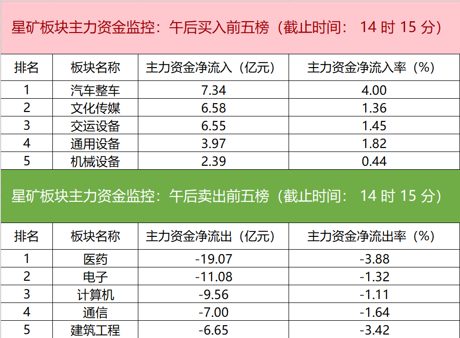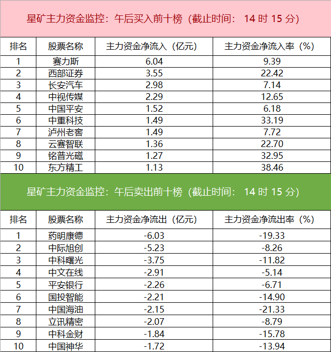 财联社2月23日电,财联社星矿数据显示,今日主力资金净流入汽车整车、文化传媒、交运设备等板块,净流出医药、电子、计算机等板块,其中医药板块净流出19.07亿元。个股方面,赛力斯涨停,主力资金净买入6.04亿元居首位,西部证券、长安汽车、中视传媒获主力资金净流入居前;药明康德遭净卖出6.03亿元居净流出首位,中际旭创、中科曙光、中文在线等主力资金净流出额居前。