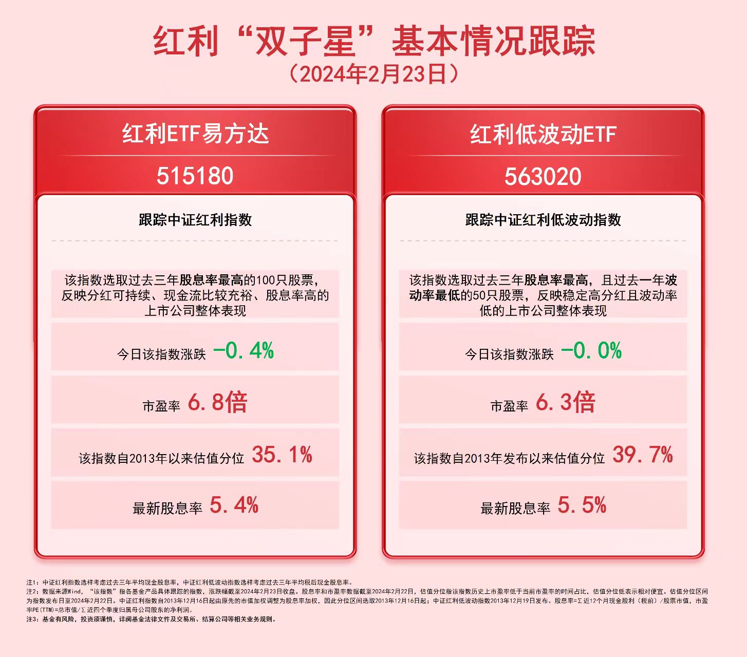 红利“双子星”小幅回调,红利ETF易方达(515180)、红利低波动ETF(563020)等产品配置高股息资产