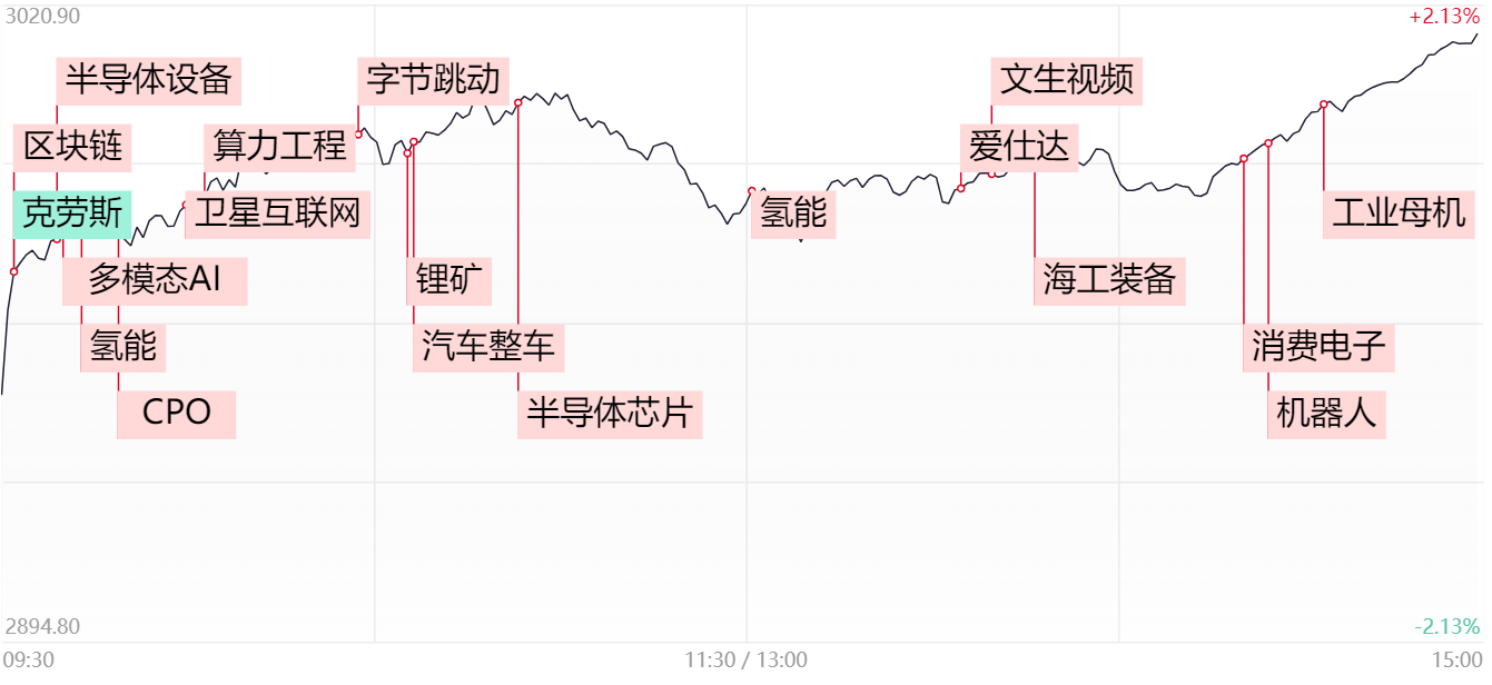 财联社3月1日电,上个交易日,三大股指承接昨日惯性集体低开,但芯片半导体盘初展开一波凌厉拉升,带动股指翻红。午后氢能概念大放异彩,消费电子、机器人等相继拉升,沪指尾盘站稳3000点上方。沪深两市成交额10526亿,较前日缩量3041亿。1)半导体产业链今早率先爆发,光刻机等设备方向领涨,蓝英装备、新莱应材、江化微、奥普光电、雅克科技、盈方微、紫光国微等悉数涨停。中微公司、盛美上海等多家半导体设备行业龙头发布的2023年业绩快报表现总体超出市场预期,作为行业先行指标的半导体设备端率先转暖,或印证行业景气度复苏。2)氢能概念再度大放异彩,新动力、亿华通、厚普股份、四川金顶、康普顿等大批成分股涨停,50多家成分股涨超9%。财联社记者从可靠渠道获悉,山东省交通运输厅、山东省发改委、山东省科技厅三部门近日发布《关于对氢能车暂免收取高速公路通行费的通知》,自2024年3月1日起,对本省高速公路安装ETC套装设备的氢能车辆免收高速公路通行费。3)机器人、工业母机概念人气居高不下,东方精工走出5连板,天永智能、爱仕达双双走出地天板,鸣志电器、华东重机、华东数控等纷纷涨停,德恩精工、华昌达、华中数控、浙海德曼等多股涨超10%。工信部、国家发改委、财政部、国家税务总局等四部门组织开展2023年度享受研发费用加计扣除政策的工业母机企业清单制定工作。4)消费电子板块盘中补涨势头积极,福蓉科技、昀冢科技、福日电子、欧菲光、可川科技、维信诺等纷纷涨停,思泉新材涨超10%。消息面上,中国信息通信研究院2月28日发布的数据显示,2024年1月,中国市场手机出货量3177.8万部,同比增长68.1%。