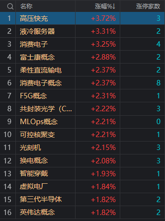 财联社3月1日电,市场早盘窄幅震荡,三大指数均小幅上涨。盘面上,消费电子概念股集体走强,卓翼科技、福蓉科技、日久光电、新亚电子等涨停。AI概念股反复活跃,其中液冷、CPO方向领涨,汇源通信、浪潮信息、中瓷电子等涨停;数据要素概念股盘中拉升,科创信息20CM涨停,零点有数、中科信息涨超5%。充电桩概念股盘中异动,英可瑞、奥特迅涨停。下跌方面,高位股继续退潮,华扬联众、标准股份跌停。总体上个股上涨和下跌家数基本相当。沪深两市半日成交额6678亿,较上个交易日缩量4亿。板块方面,液冷服务器、CPO、消费电子、充电桩等板块涨幅居前,人造肉、猪肉、Sora概念、免税店等板块跌幅居前。截至收盘,沪指涨0.09%,深成指涨0.45%,创业板指涨0.12%。北向资金方面,沪股通早盘净流出15.8亿,深股通早盘净流出41.9亿。