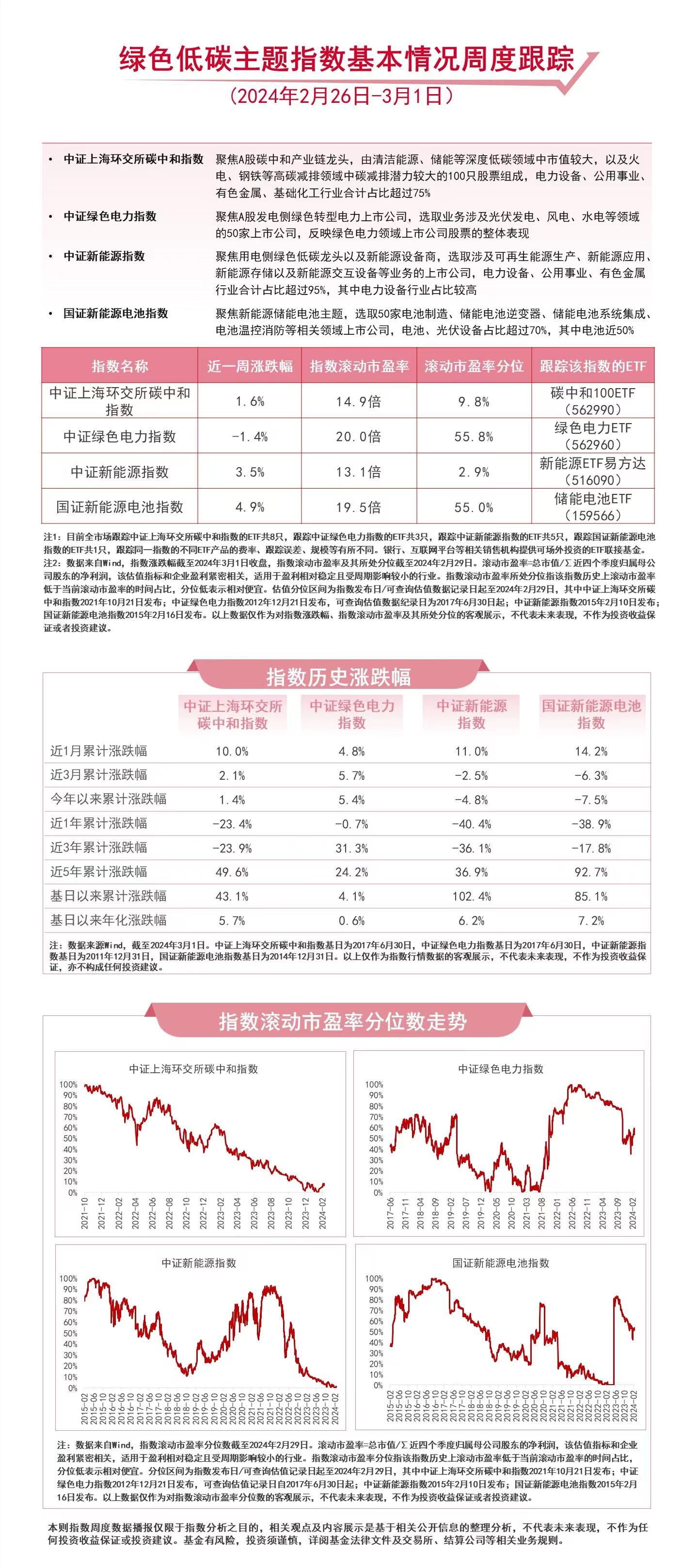 财联社3月1日电,截至周五收盘,本周中证上海环交所碳中和指数上涨1.6%,中证绿色电力指数下跌1.4%,中证新能源指数上涨3.5%,国证新能源电池指数上涨4.9%。近日,工信部等七部门发布《关于加快推动制造业绿色化发展的指导意见》提出,构建清洁高效低碳的工业能源消费结构,实施煤炭分质分级清洁高效利用行动,有序推进重点用能行业煤炭减量替代;鼓励具备条件的企业、园区建设工业绿色微电网,推进多能高效互补利用,就近大规模高比例利用可再生能源;加快推进终端用能电气化,拓宽电能替代领域,提升绿色电力消纳比例。我国风电、光伏等资源丰富,发展新能源潜力巨大。经过持续攻关和积累,我国多项新能源技术和装备制造水平已全球领先,建成了世界上最大的清洁电力供应体系,新能源汽车、锂电池和光伏产品还在国际市场上形成了强大的竞争力,新能源发展已经具备了良好基础,我国成为世界能源发展转型和应对气候变化的重要推动者。