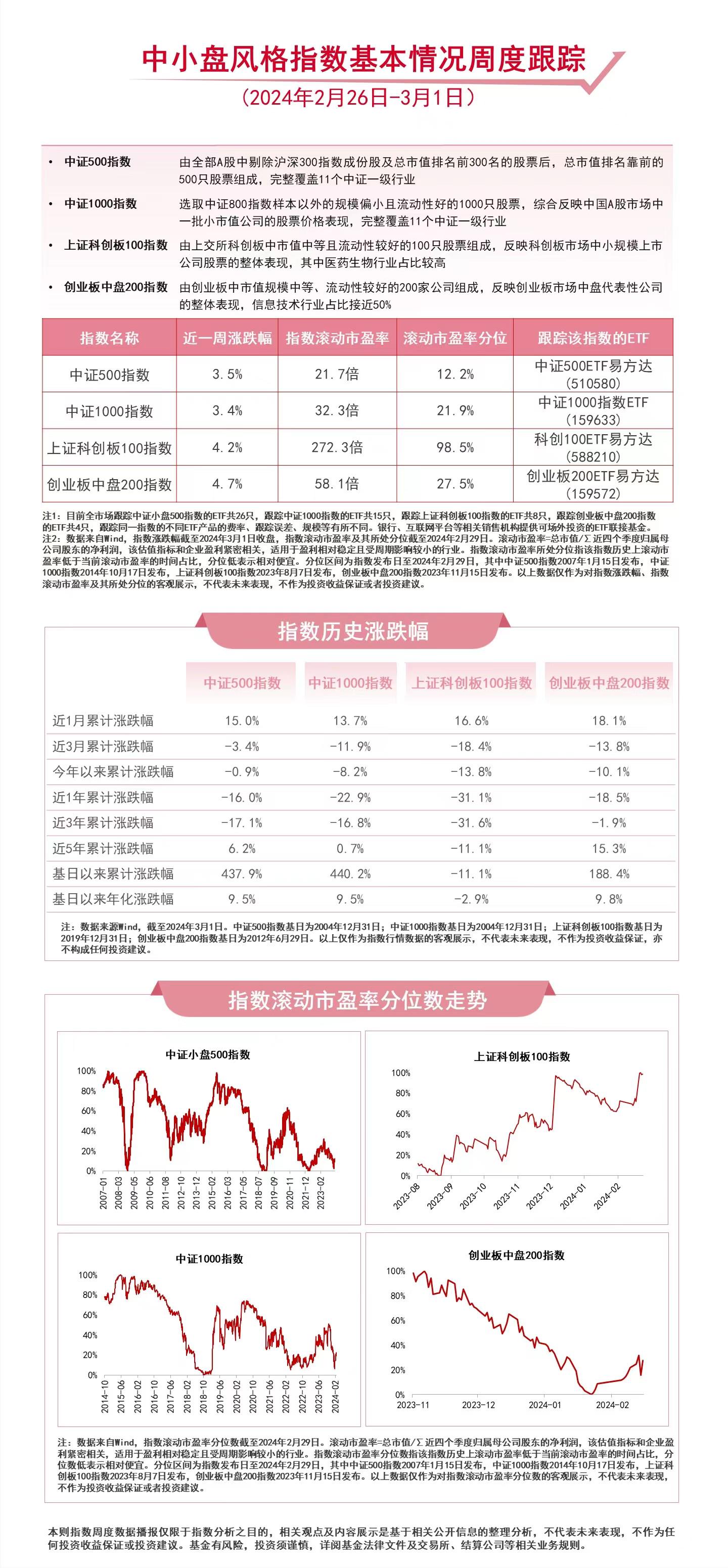 财联社3月1日电,截至周五收盘,本周中证500指数上涨3.5%,中证1000指数上涨3.4%,上证科创板100指数上涨4.2%,创业板中盘200指数上涨4.7%。中信证券认为,小盘市值风格占优期间具有共性的驱动因素,2024年多方面因素有望驱动小盘行情:第一,以AI为代表的新兴产业仍然处于上行周期,渗透率提升逻辑是驱动小盘占优风格的核心因素;第二,减持新规和并购重组支持政策有望助推中小盘行情。