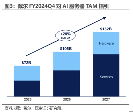 AI推理端需求不断提升或推动算力需求进入全新阶段,戴尔大幅上调AI服务器全球TAM,2027年或达到1520亿美元。英伟达预计2023年40%的算力用于推理,同时各类应用正在加速转变为AI驱动,如消费者互联网公司正在投资生成式 AI,通过内容创作和广告、在线产品描述和人工智能购物辅助的自动化工具,为内容创作者、广告商和客户提供支持;企业软件公司正在应用生成式人工智能来帮助客户实现生产力的提高;推荐系统是地球上最大的单一软件引擎,而其正在由CPU驱动转向GPU驱动等。基于良好的AI服务器需求前景,戴尔预计2025/2027年全球AI服务器TAM分别达到1050亿美元/1520亿美元,高于FY2024Q3时预期的910亿美元/1240亿美元。