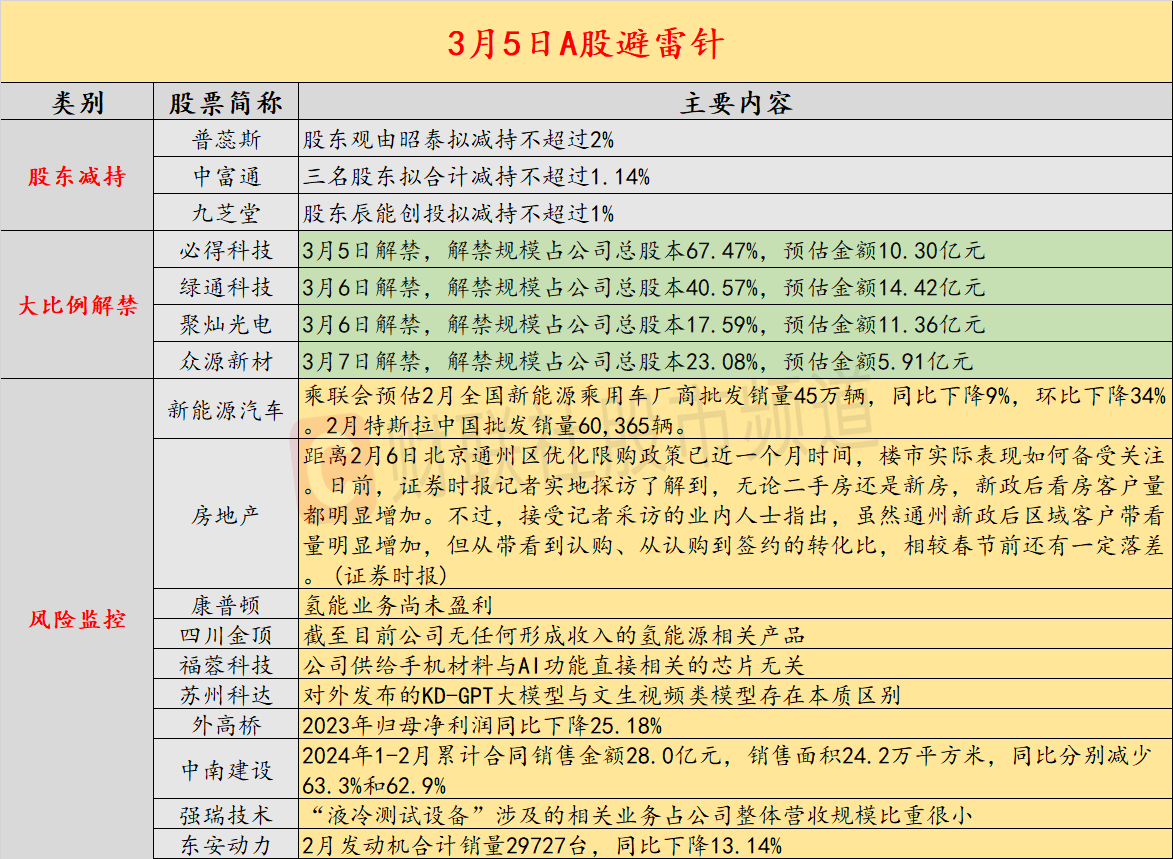 昨日公告的A股拟减持的公司数量较之前有所减少,普蕊斯股东观由昭泰拟减持不超过2%;必得科技、绿通科技将迎来超四成以上解禁;乘联会预估2月全国新能源乘用车厂商批发销量同比降9%、环比降34%;5连板四川金顶公告,截至目前公司无任何形成收入的氢能源相关产品;北京通州“双限”松绑满月,看房客户明显增加,成交转化比有落差;3连板福蓉科技表示,公司供给手机材料与AI功能直接相关的芯片无关;美股三大指数集体收跌,特斯拉重挫逾7%。