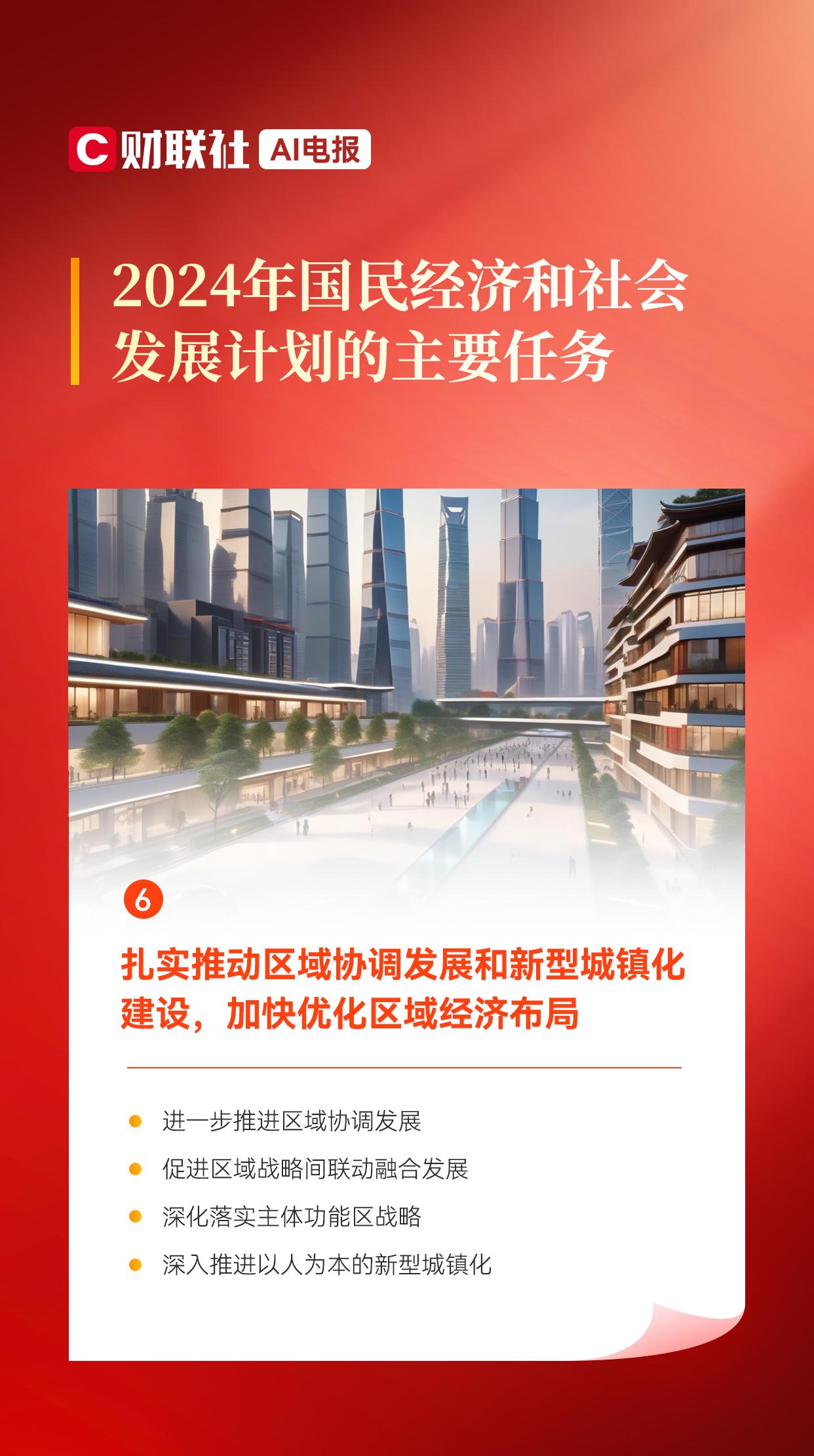 财联社3月5日电,国家发改委3月5日发布《2024年国民经济和社会发展计划的主要任务》。其中提出,扎实推动区域协调发展和新型城镇化建设,加快优化区域经济布局。