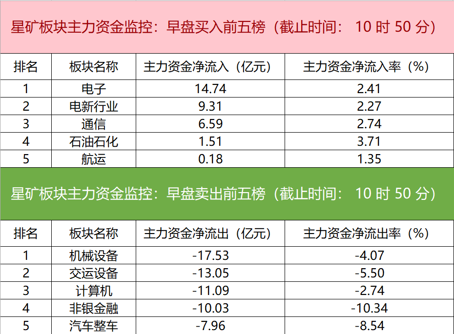 财联社3月8日电,财联社星矿数据显示,今日早盘主力资金净流入电子、电新行业、通信等板块,净流出机械设备、交运设备、计算机等板块,其中机械设备板块净流出超17亿元。个股方面,光迅科技大涨,主力资金净买入5.64亿元位居首位,通富微电、隆基绿能、晶澳科技获主力资金净流入居前;赛力斯遭净卖出超5亿元,东方精工、天奇股份、紫光股份主力资金净流出额居前。