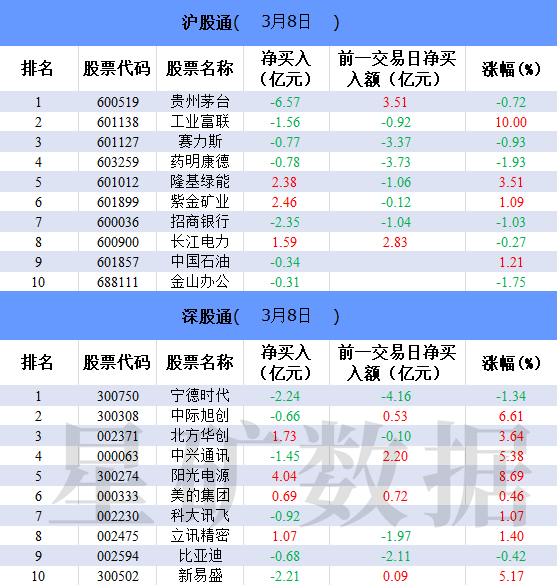 财联社3月8日电,北向资金今日大幅净买入60.0亿元。阳光电源、紫金矿业、隆基绿能分别获净买入4.04亿元、2.46亿元、2.38亿元。贵州茅台净卖出额居首,金额为6.57亿元。