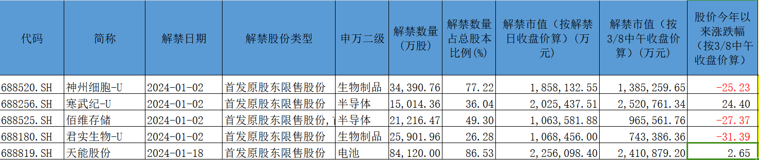星矿数据显示,解禁市值超过200亿元的天能股份1月18日解禁8.41亿股,均为首发原股东限售股份。寒武纪-U于1月2日解禁1.50亿股,也均为首发原股东限售股份。