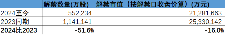 ①2024年至今,科创板共有157只股票面临解禁,合计解禁量为55.22亿股,与2023年同期的114.11亿股比较,解禁数量减少51.61%; ②按解禁日收盘价计算,合计解禁市值为2128.17亿元,较2023年同期减少16%。