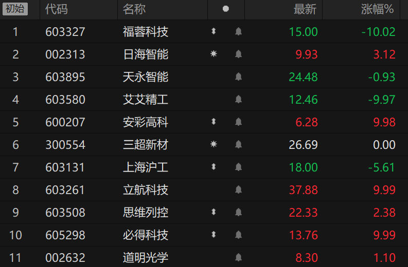 财联社3月11日电,市场焦点股福蓉科技(7天6板)低开10.02%,算力概念股日海智能(12天6板)高开3.12%,新型工业化板块天永智能(10天5板)低开0.93%、艾艾精工(4板)竞价跌停,光伏股安彩高科(4板)高开9.98%、三超新材(创业板3天2板)平开,军工股上海沪工(4板)低开5.61%、立航科技(4板)竞价涨停,高铁板块思维列控(6天4板)高开2.38%、必得科技(2板)竞价涨停,消费电子板块道明光学(5天3板)高开1.10%。