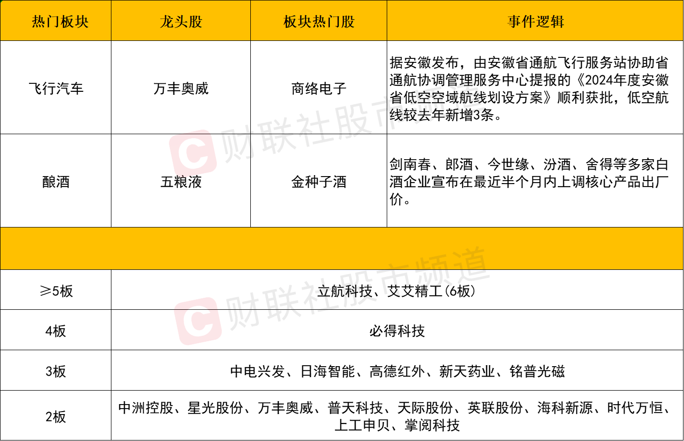 从个股角度来看,目前飞行汽车概念股无疑是当前市场延续性最强的题材,高标立航科技晋级6连板拓宽板块高度,万丰奥威与金盾股份也走出了强趋势性。在其带动下一些后排的延伸性个股也迎来了集体补涨,但需注意的是,在今日飞行汽车概念股集体爆发后情绪端或趋于高潮,结合今日尾盘阶段高标之一的安彩高科尾盘突然跳水翻绿,也预示着高位股方向的筹码并不稳固。预计明日飞行汽车板块内部的分歧可能会进一步的加剧,届时仍可持续关注两大方向:其一是能够顶住前排分歧活口标的、其二是资金在产业链延伸方向挖掘具有预期差的新机会。