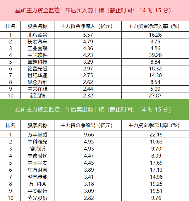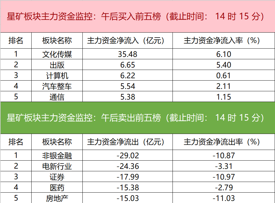 财联社3月13日电,财联社星矿数据显示,今日主力资金净流入文化传媒、出版、计算机等板块,净流出非银金融、电新行业、证券等板块,其中文化传媒板块净流入35.48亿元。个股方面,北汽蓝谷涨停,主力资金净买入5.57亿元居首位,长安汽车、工业富联、中国软件获主力资金净流入居前;万丰奥威遭净卖出9.66亿元居净流出首位,中科曙光、赛力斯、宁德时代等主力资金净流出额居前。