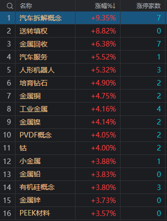 财联社3月15日电,市场全天探底回升,三大指数均小幅收涨,沪指周线录得5连阳。盘面上,周期股集体活跃,其中有色金属概念股再度走强,北方铜业、鹏欣资源、顺博合金涨停;有机硅概念股午后异动,晨化股份、晨光新材、宏达新材涨停。汽车拆解概念股维持强势,超越科技、怡球资源、格林美等涨停。CPO概念股反复活跃,新易盛涨超10%,天孚通信、中际旭创均创历史新高。机器人概念股震荡走强,鸣志电器、雷赛智能、夏厦精密等10余股涨停。飞行汽车概念股探底回升,万丰奥威、永悦科技涨停。下跌方面,煤炭股再度调整,潞安环能等跌超3%。总体上个股涨多跌少,全市场超4300只个股上涨。沪深两市今日成交额9445亿,较上个交易日缩量627亿,成交金额跌破万亿。板块方面,汽车拆解概念、人形机器人、金属铜、有机硅等板块涨幅居前,煤炭、Sora概念、CRO等板块跌幅居前。截至收盘,沪指涨0.54%,深成指涨0.6%,创业板指涨0.06%。北向资金全天净买入103.26亿,其中沪股通净买入67.92亿元,深股通净买入35.34亿元。