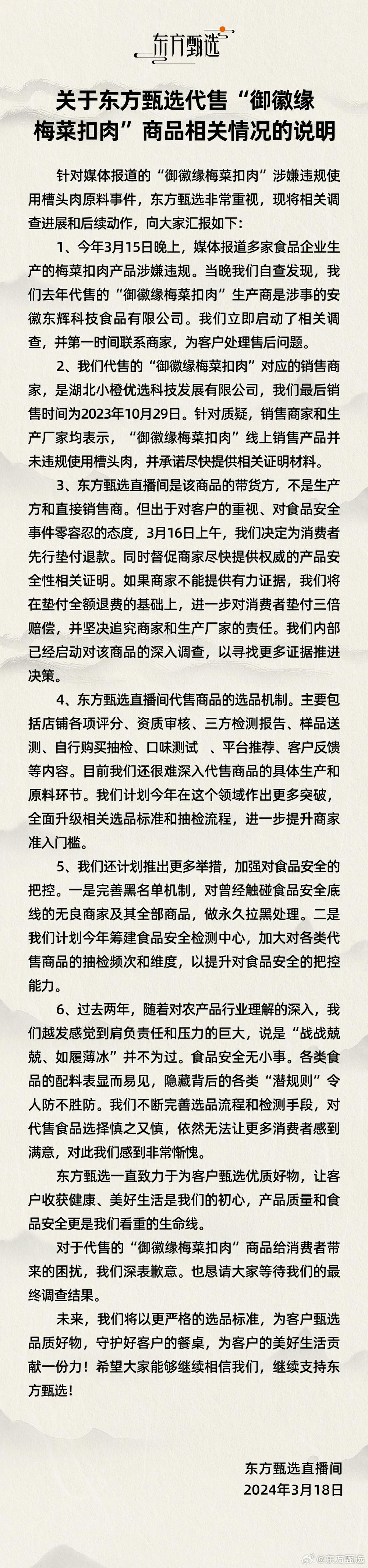财联社3月18日电,东方甄选发布声明为代售“御徽缘梅菜扣肉”致歉,将垫付全额退费,如商家不能提供有力证据,将垫付三倍赔偿。
