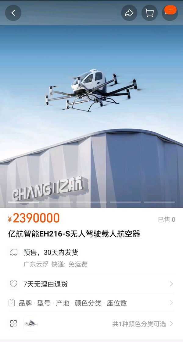 财联社3月18日电,全球首个获得适航认证的国产自研“空中的士”亿航EH216-S今日在淘宝上架,标价239万元。 (大湾区之声)