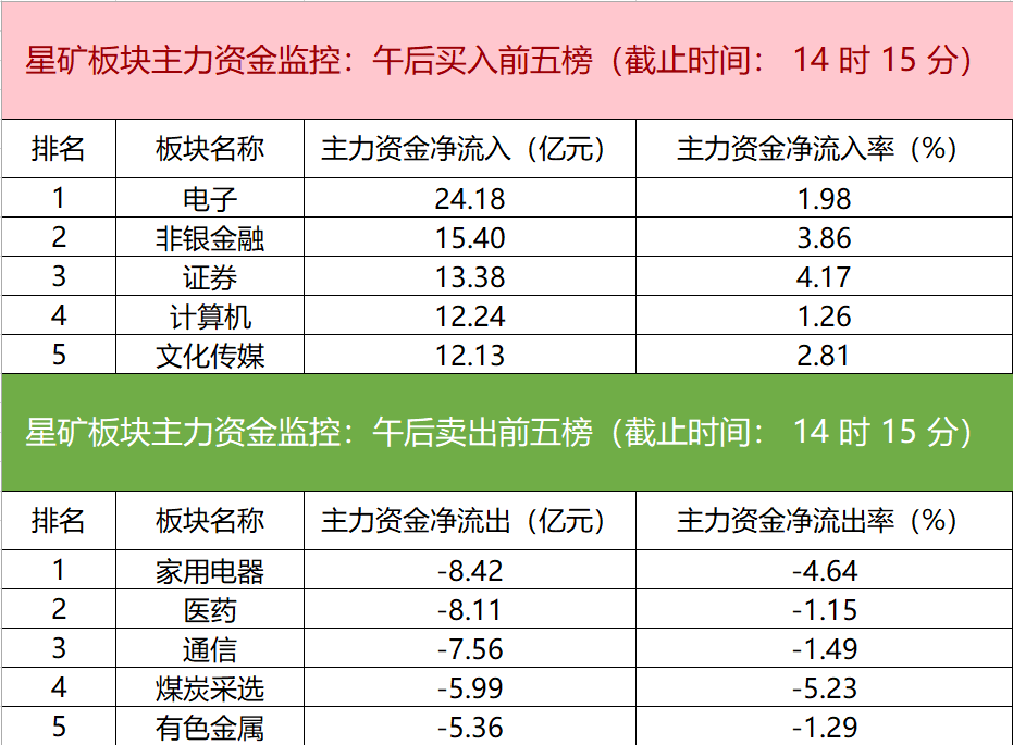 财联社3月18日电,财联社星矿数据显示,今日主力资金净流入电子、非银金融、证券等板块,净流出家用电器、医药、通信等板块,其中电子板块净流入24.18亿元。个股方面,工业富联大涨,主力资金净买入9.73亿元居首位,方正证券、寒武纪、浪潮信息获主力资金净流入居前;北汽蓝谷遭净卖出7.88亿元居净流出首位,药明康德、星光股份、南京熊猫等主力资金净流出额居前。