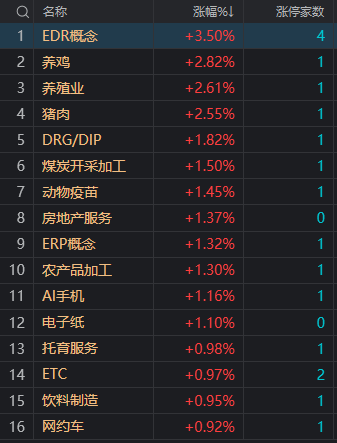 财联社3月19日电,市场早盘震荡调整,三大指数均小幅下跌。盘面上,猪肉股迎来反弹,湘佳股份涨停,傲农生物涨超9%。智能驾驶概念股盘中拉升,天迈科技、万集科技、金溢科技、瑞玛精密等多股涨停。低空经济概念股反复活跃,四川九洲、永悦科技、安邦护卫涨停。消费电子概念股震荡走强,紫建电子、福蓉科技、瀛通通讯等涨停。算力、CPO概念股局部活跃,高新发展再创新高,兆龙互连20CM涨停。下跌方面,机器人概念股展开调整,步科股份跌超5%。总体上个股跌多涨少,全市场超3400只个股下跌。沪深两市半日成交额6933亿,较上个交易日缩量176亿。板块方面,猪肉、煤炭、AI手机、智能驾驶等板块涨幅居前,人形机器人、脑机接口、证券、保险等板块跌幅居前。截至收盘,沪指跌0.39%,深成指跌0.24%,创业板指跌0.65%。北向资金方面,沪股通早盘净流出35.4亿,深股通早盘净流出19.4亿。