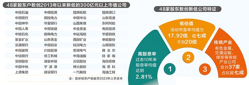 财联社3月20日电,股东户数持续减少,代表着中小投资者陆续出清,也显示出公司的筹码被更多的机构投资者所持有。A股还有哪些行业龙头公司股东户数呈现减少趋势?以3月15日A股市值超300亿元的公司为样本,统计发现,按年度计算(由于绝大多数公司尚未披露2023年年报,2023年股东户数取三季度末计算),截至2023年三季度末,股东户数创下2013年以来新低的公司有48家。这48家公司普遍具有低估值高股息率的特征。数据显示,这些公司过去10年来股息率均值达到2.81%。截至3月15日,这些公司滚动市盈率均值为17.92倍,其中超七成滚动市盈率不到20倍。行业分布上也有鲜明特征,这些公司主要分布于有色金属、煤炭、交通运输、公用事业、银行、建筑装饰、石油石化等行业,均属于典型的传统产业。 (证券时报)