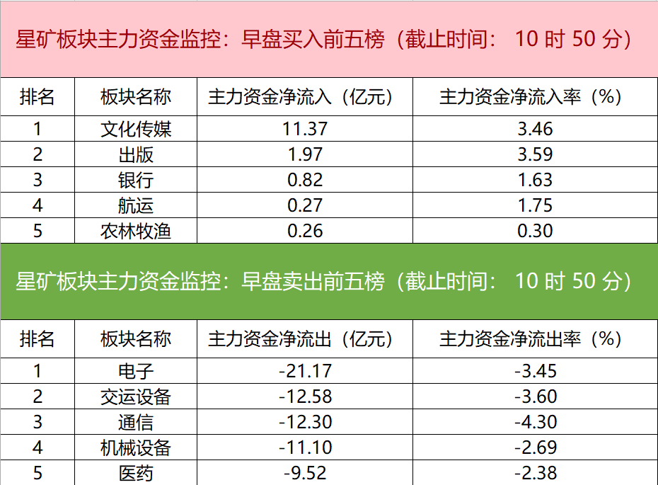 财联社3月20日电,财联社星矿数据显示,今日早盘主力资金净流入文化传媒、出版、银行等板块,净流出电子、交运设备、通信等板块,其中电子板块净流出超21亿元。个股方面,中科曙光上涨,主力资金净买入4.70亿元位居首位,华策影视、中广天择、掌阅科技获主力资金净流入居前;药明康德遭净卖出超5亿元,电广传媒、北汽蓝谷、四川长虹主力资金净流出额居前。