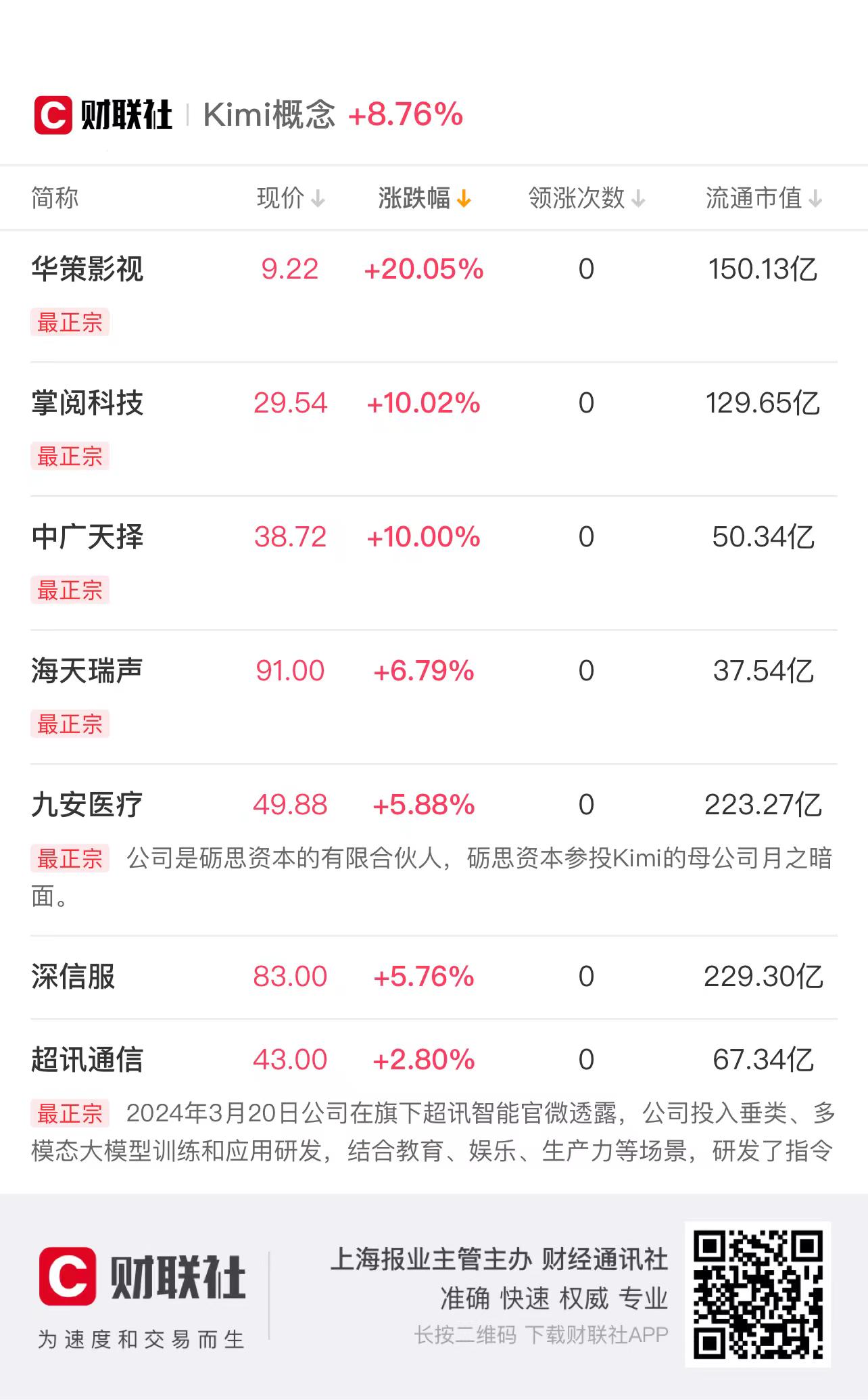 财联社3月21日电,华策影视、掌阅科技、中广天择涨停,海天瑞声、九安医疗、深信服、超讯通信等跟涨。消息面上,23年12月~24年2月,Kimi月活跃用户分别为50.83万人、112.85万人、298.46万人,同比增长122%/164%。